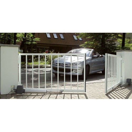 ROTAMATIC szárnyaskapu-meghajtás kétszárnyú nyílókapukhoz, 1 db HS 5 BS típusú távirányítóval. SK verzió: a nagyobb biztonság érdekében, egyutas fénysorompóval és sárga jelzőlámpával.